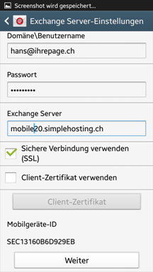 • Bei Exchange Server geben sie smail1.simplehosting.ch oder smail2.simplehosting.ch an ( je nach dem auf welchem Server sich ihr Mailhosting befindet. )