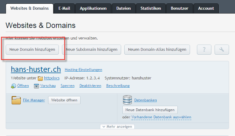 4. Hinweis: Bitte geben Sie immer ein neues Stammverzeichnis an für eine zusätzliche Domain in einem bestehenden Abonnement. Bei einer allfälligen Löschung einer Domain wird auch der Inhalt des verwendeten Stammverzeichnisses entfernt, auch wenn dieses noch einer anderen Domain zugeordnet ist.