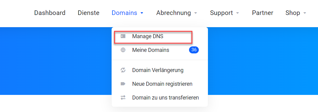 - Gehen sie zu Domains und dann wählen sie den Menüpunkt "Manage DNS" aus um zum DNS Management zu gelangen