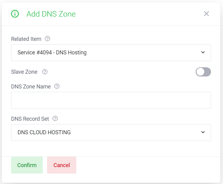 - Wählen sie nun bei bei Related Item ihren DNS Hosting Service aus um eine neue nicht bei uns registrierte DNS Zone für eine Domain zu erstellen.