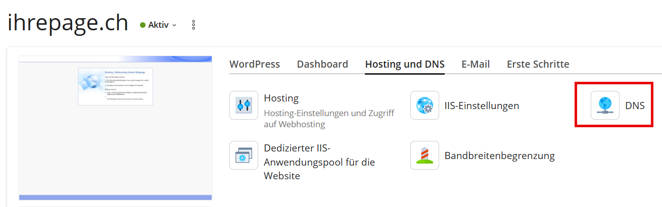 6. Gehen sie zurück zur Hosting Übersicht und wählen das Register "Hosting und DNS" aus.