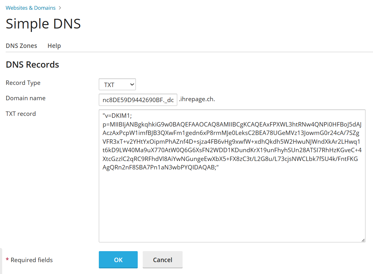 8. Erstellen sie nun einen TXT DNS Eintrag mit den vorherig gespeicherten Werten. Dies sollte in etwa so aussehen.